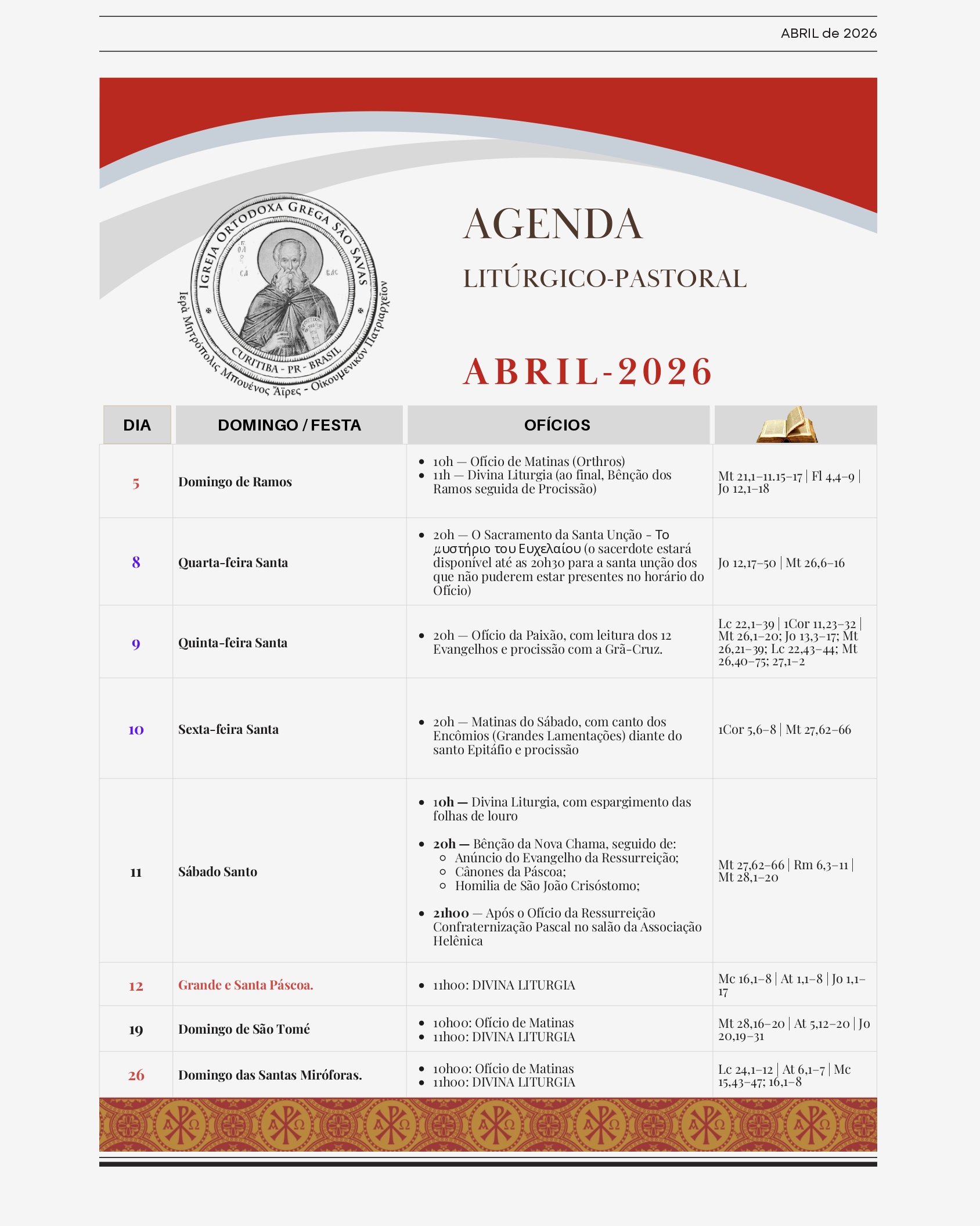 Que São Savas, padroeiro de nossa Igreja, interceda a Deus por todos nós, por nossas famílias, amigos e fieis, e que, uma vez irmanados pela sua proteção, testemunhemos a fé no Cristo, o Caminho, a Verdade e a Vida.