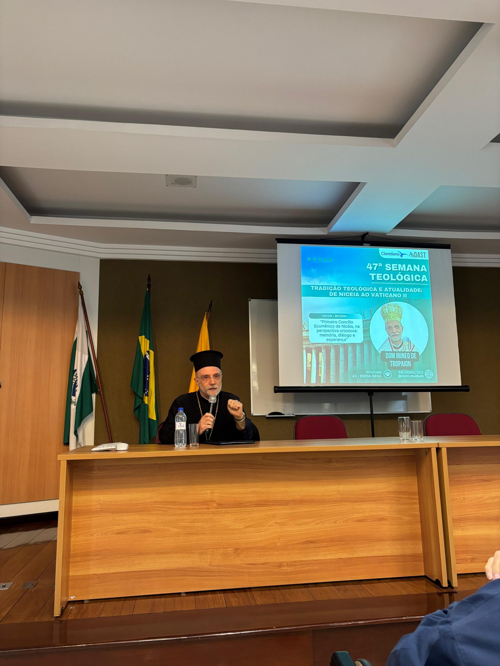 O encerramento ocorreu na manhã do dia 26, com a conferência de Dom Irineo de Tropaion sobre “O Primeiro Concílio Ecumênico de Niceia na perspectiva da Igreja Ortodoxa: memória, diálogo e esperança”. A palestra reuniu alunos, professores, religiosos e sacerdotes, além de representantes das comunidades ortodoxas de Curitiba, entre eles Dom Jeremias Ferens, Arcebispo da Eparquia Ucraniana; o Pe. Samaan Nasry, da Paróquia São Jorge (Arquidiocese Antioquina); e o diácono Arsênios Ferreira da Costa, da Igreja Grega São Savas.